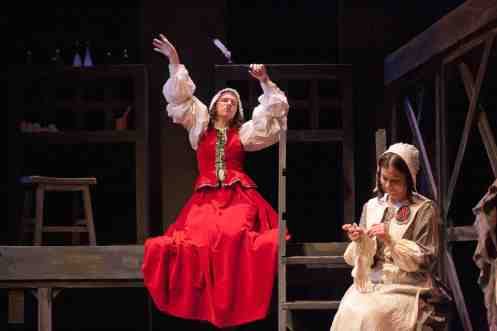 Once again, the Plan-B technical talent excels as well as the talent on stage. Cheryl Cluff’s direction is fluid, and her sound design memorable for its blend of choral music and recorded chants of Hester’s townspeople mocking her. Randy Rasmussen’s set is built on a multipurpose, striking structure with multiple levels for the characters to use–a really impressive use of the simple space inside the Rose Wagner Performing Arts Center. The costumes, the lighting, the props like the cat o’ nine tails Dimmesdale uses to flog himself–it all works perfectly in tune with the actors and Nii’s glorious, musical dialogue.