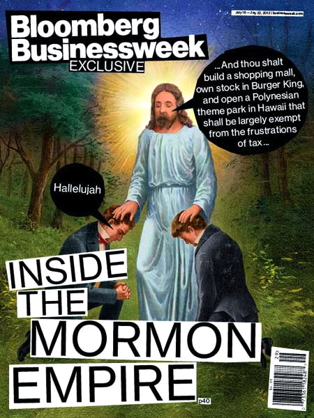 On the national scene, the latest hapless victims being called anti-Mormon bigots are Andrew Sullivan at The Daily Beast and the editors at Bloomberg Business Week. BBW inexplicably gave Mormons an easy opening to attack an otherwise solid story on LDS Church finances by attaching a gratuitously tasteless cover image, shown above.
