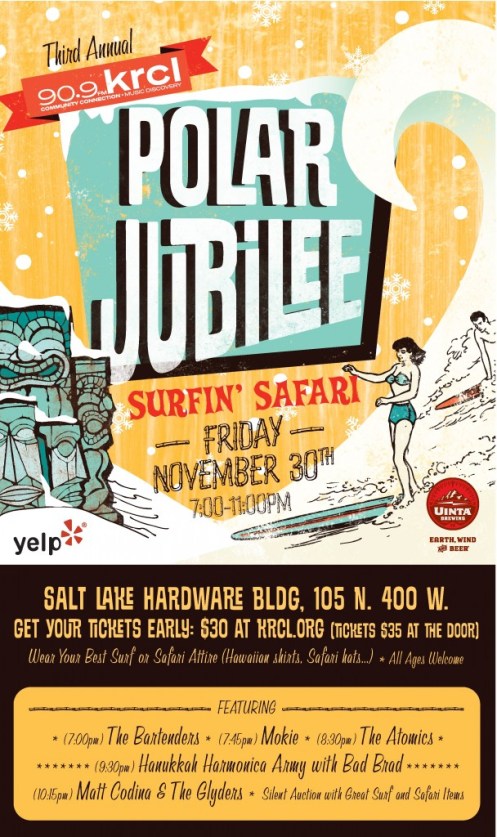 This is the third year that community radio station KRCL has thrown a holiday fundraiser, and the theme of this year’s Polar Jubilee is “Surfin’ Safari.” What does that mean for you, the KRCL-loving Utahn who loves a good party? Well, a heavy dose of surf music for one thing, courtesy of bands the Bartenders, Mokie, and The Atomics. It also means the return of the Hanukkah Harmonica Army led by the station’s Bad Brad Wheeler, as well as cocktails, a photo booth, auction and grub while you hang with what is always a fun crowd. You can sport some surf or safari-themed attire, but you might want to check the Friday night predicted temps before you break out the grass skirt and coconut bra.